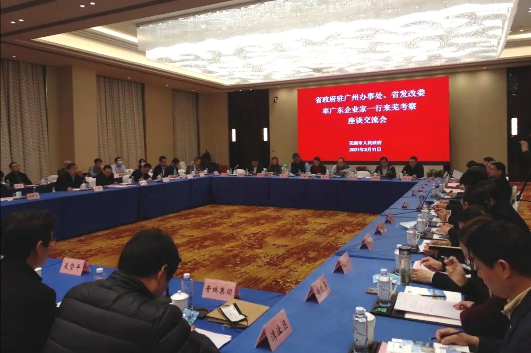 2021年3月11日-12日,我司董事长钱猛先生等广东企业家代表团在安徽省政府驻广州办事处主任郑训练的带领下,赴芜湖、马鞍山两地考察并进行座谈交流。
